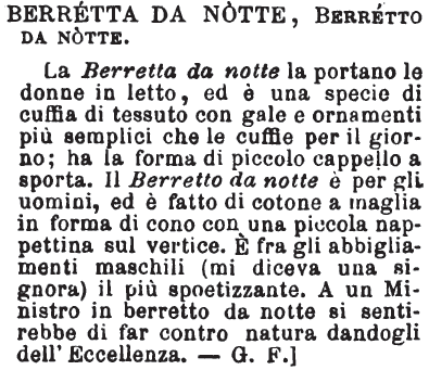 | Berretta da notte, Berretto da notte - La Berretta da notte la portano le donne in letto, ed è una specie di cuffia di tessuto con gale e ornamenti più semplici che le cuffie per il giorno; ha la forma di piccolo cappello a sporta. Il Berretto da notte è per gli uomini, ed è fatto di cotone a maglia in forma di cono con una piccola nappettina sul vertice. È fra gli abbigliamenti maschili (mi diceva una signora) il più spoetizzante. A un Ministro in berretto da notte si sentirebbe di far contro natura dandogli dell'Eccellenza. - G. F.] [immagine] |