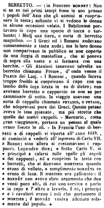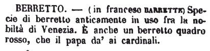| Berretto - (in francese barrette) Specie di berretto anticamente in uso fra la nobiltà di Venezia. E' anche un berretto quadro rosso, che il papa da' ai cardinali. [immagine] |