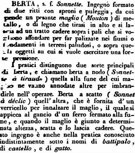 Berta - s. f. Sonnette. Ingegno formato di due ritti con sproni e puleggia, da cui pende un pesante maglio (Mouton) di metallo, o di legno che tirasi in alto e si lascia ad un tratto cadere sopra i pali che si vogliono affondare per far palizzate nei fiumi o fondamenti in terreni paludosi, o sopra quegli oggetti su cui si vuole esercitare una forte pressione.