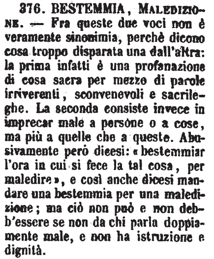 | Bestemmia, Maledizione - Fra queste due voci non è veramente sinonimia, perchè dicono cosa troppo disparata una dall'altra: la prima infatti è una profanazione di cosa sacra per mezzo di parole irriverenti, sconvenevoli e sacrileghe. La seconda consiste invece in imprecar male a persone o a cose, ma più a quelle che a queste. Abusivamente però dicesi: «bestemmiar l'ora in cui si fece la tal cosa, per maledire», e così anche dicesi mandare una bestemmia per una maledizione; ma ciò non può e non debb'essere se non da chi parla doppiamente male, e non ha istruzione e dignità. [immagine] |