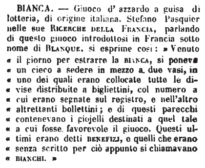 | Bianca - Giuoco d'azzardo a guisa di lotteria, di origine italiana. Stefano Pasquier nelle sue Ricerche della Francia, parlando di questo giuoco introdottosi in Francia sotto nome di Blanque, si esprime così: « Venuto il giorno per estrarre la bianca, si poneva un cieco a sedere in mezzo a due vasi, in uno dei quali erano collocate tutte le divise distribuite a bigliettini, col numero a cui erano segnate sul registro, e nell'altro altrettanti bollettini; e di questi parecchi contenevano i giojelli destinati a quel tale a cui fosse favorevole il giuoco. Questi ultimi erano detti benefizj, e quelli che erano senza scritto per ciò appunto si chiamavano bianchi. » [immagine] |