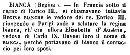 | Bianca (regina) - In Francia sotto il regno di Enrico III., si chiamavano tuttavia Regine bianche le vedove dei re. Enrico III. giungendo a Parigi andò a salutare la regina bianca, ch'era allora Elisabetta d'Austria, vedova di Carlo IX. Davasi loro il nome di bianca, perchè portavano di bianco il corruccio pei loro sposi. [immagine] |