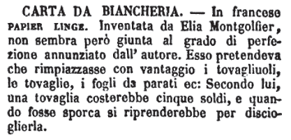 | Carta da biancheria - In francese papier linge. Inventata da Elia Montgolfier, non sembra però giunta al grado di perfezione annunziato dall'autore. Esso pretendeva che rimpiazzasse con vantaggio i tovagliuoli, le tovaglie, i fogli da parati ec: Secondo lui, una tovaglia costerebbe cinque soldi, e quando fosse sporca si riprenderebbe per discioglierla. [immagine] |