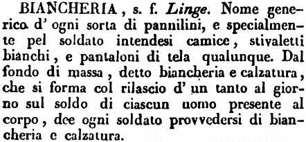 | Biancheria - s. f. Linge. Nome generico d'ogni sorta di pannilini, e specialmente pel soldato intendesi camice, stivaletti bianchi, e pantaloni di tela qualunque. Dal fondo di massa, detto biancheria e calzatura, che si forma col rilascio d'un tanto al giorno sul soldo di ciascun uomo presente al corpo, dee ogni soldato provvedersi di biancheria e calzatura. [immagine] |