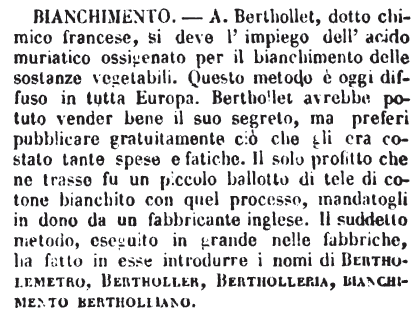 | Bianchimento - A. Berthollet, dotto chimico francese, si deve l'impiego dell'acido muriatico ossigenato per il bianchimento delle sostanze vegetabili. Questo metodo è oggi diffuso in tutta Europa. Berthollet avrebbe potuto vender bene il suo segreto, ma preferì pubblicare gratuitamente ciò che gli era costato tante spese e fatiche. Il solo profitto che ne trasse fu un piccolo ballotto di tele di cotone bianchito con quel processo, mandatogli in dono da un fabbricante inglese. Il suddetto metodo, eseguito in grande nelle fabbriche, ha fatto in esse introdurre i nomi di Bertholemetro, Bertholler, Bertholleria, bianchimento bertholliano. [immagine] |