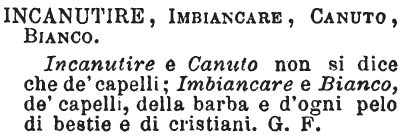 | Incanutire, Imbiancare, Canuto, Bianco - Incanutire e Canuto non si dice che de' capelli; Imbiancare e Bianco, de' capelli, della barba e d'ogni pelo di bestie e di cristiani. G. F. [immagine] |
