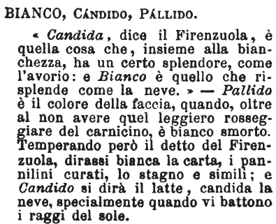 | Bianco, Candido, Pallido - «Candida, dice il Firenzuola, è quella cosa che, insieme alla bianchezza, ha un certo splendore, come l'avorio: e Bianco è quello che risplende come la neve.» - Pallido è il colore della faccia, quando, oltre al non avere quel leggiero rosseggiare del carnicino, è bianco smorto. Temperando però il detto del Firenzuola, dirassi bianca la carta, i pannilini curati, lo stagno e simili; e Candido si dirà il latte, candida la neve, specialmente quando vi battono i raggi del sole. [immagine] |
