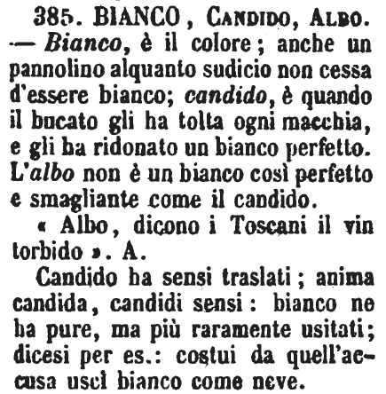 Bianco, Candido, Albo - Bianco, è il colore; anche un pannolino alquanto sudicio non cessa d'essere bianco; candido, è quando il bucato gli ha tolta ogni macchia, e gli ha ridonato un bianco perfetto. L'albo non è un bianco così perfetto e smagliante come il candido.