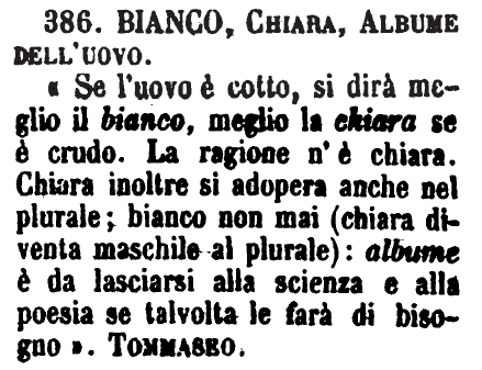 | Bianco, Chiara, Albume dell’uovo - «Se l'uovo è cotto, si dirà meglio il bianco, meglio la chiara se è crudo. La ragione n'è chiara. Chiara inoltre si adopera anche nel plurale; bianco non mai (chiara diventa maschile al plurale): albume è da lasciarsi alla scienza e alla poesia se talvolta le farà di bisogno». Tommaseo. [immagine] |