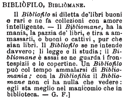 | Bibliofilo, Bibliomane - Il Bibliofilo si diletta de' libri buoni e rari e ne fa collezioni con amore intelligente. - Il Bibliomane, ha la manìa, la pazzia de' libri, e tira a ammassarli, o buoni o cattivi, pur che sian libri. Il Bibliofilo se ne intende davvero; li legge e li studia; il Bibliomane è assai se ne guarda i frontespizii e le copertine. Un Bibliofilo può col tempo ammalarsi di Bibliomania; con la Bibliofilia il Bibliomane non ci ha nulla che vedere: egli sta meglio nel manicomio che in biblioteca. - G.F.] [immagine] |