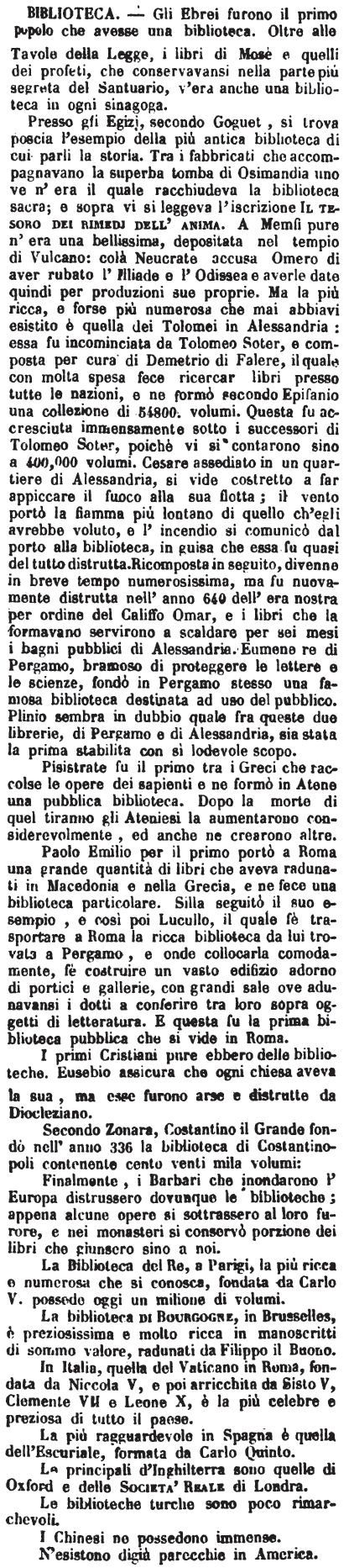 Presso gli Egizj, secondo Goguet, si trova poscia l'esempio della più antica biblioteca di cui parli la storia. Tra i fabbricati che accompagnavano la superba tomba di Osimandia uno ve n'era il quale racchiudeva la biblioteca sacra; e sopra vi si leggeva l'iscrizione Il tesoro dei rimedj dell'anima. A Memfi pure n'era una bellissima, depositata nel tempio di Vulcano: colà Neucrate accusa Omero di aver rubato l'Illiade e l'Odissea e averle date quindi per produzioni sue proprie. Ma la più ricca, e forse più numerosa che mai abbiavi esistito è quella dei Tolomei in Alessandria: essa fu incominciata da Tolomeo Soter, e composta per cura di Demetrio di Falere, il quale con molta spesa fece ricercar libri presso tutte le nazioni, e ne formò secondo Epifanio una collezione di 54800. volumi. Questa fu accresciuta immensamente sotto i successori di Tolomeo Soter, poiché vi si contarono sino a 400,000 volumi. Cesare assediato in un quartiere di Alessandria, si vide costretto a far appiccare il fuoco alla sua flotta; il vento portò la fiamma più lontano di quello ch'egli avrebbe voluto, e l'incendio si comunicò dal porto alla biblioteca, in guisa che essa fu quasi del tutto distrutta. Ricomposta in seguito, divenne in breve tempo numerosissima, ma fu nuovamente distrutta nell'anno 640 dell'era nostra per ordine del Califfo Omar, e i libri che la formavano servirono a scaldare per sei mesi i bagni pubblici di Alessandria. Eumene re di Pergamo, bramoso di proteggere le lettere e le scienze, fondò in Pergamo stesso una famosa biblioteca destinata ad uso del pubblico. Plinio sembra in dubbio quale fra queste due librerie, di Pergamo e di Alessandria, sia stata la prima stabilita con sì lodevole scopo. Pisistrate fu il primo tra i Greci che raccolse le opere dei sapienti e ne formò in Atene una pubblica biblioteca. Dopo la morte di quel tiranno gli Ateniesi la aumentarono considerevolmente, ed anche ne crearono altre. Paolo Emilio per il primo portò a Roma una grande quantità di libri che aveva radunati in Macedonia e nella Grecia, e ne fece una biblioteca particolare. Silla seguitò il suo esempio, e così poi Lucullo, il quale fè trasportare a Roma la ricca biblioteca da lui trovata a Pergamo, e onde collocarla comodamente, fè costruire un vasto edifizio adorno di portici e gallerie, con grandi sale ove adunavansi i dotti a conferire tra loro sopra oggetti di letteratura. E questa fu la prima biblioteca pubblica che si vide in Roma. I primi Cristiani pure ebbero delle biblioteche. Eusebio assicura che ogni chiesa aveva la sua, ma esse furono arse e distrutte da Diocleziano. Secondo Zonara, Costantino il Grande fondò nell'anno 336 la biblioteca di Costantinopoli contenente cento venti mila volumi: Finalmente, i Barbari che inondarono l'Europa distrussero dovunque le biblioteche; appena alcune opere si sottrassero al loro furore, e nei monasteri si conservò porzione dei libri che giunsero sino a noi. La Biblioteca del Re, a Parigi, la più ricca e numerosa che si conosca, fondata da Carlo V. possede oggi un milione di volumi. La biblioteca di Bourgogne, in Brusselles, è preziosissima e molto ricca in manoscritti di sommo valore, radunati da Filippo il Buono. In Italia, quella del Vaticano in Roma, fondata da Niccola V, e poi arricchita da Sisto V, Clemente VII e Leone X, è la più celebre e preziosa di tutto il paese. La più ragguardevole in Spagna è quella dell'Escuriale, formata da Carlo Quinto. Le principali d'Inghilterra sono quelle di Oxford e delle Società Reale di Londra. Le biblioteche turche sono poco rimarchevoli. I Chinesi ne possedono immense. N'esistono digià parecchie in America. [immagine] |