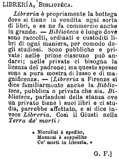 | Libreria, Biblioteca - Libreria è propriamente la bottega dove si tiene in vendita ogni sorta di libri, e se ne fa commercio anche in grande. - Biblioteca è luogo dove sono raccolti, ordinati e custoditi libri di ogni maniera, per comodo degli studiosi. Sono pubbliche e private: nelle prime ciascuno può andarvi; nelle private ci bisogna la licenza del padrone; ma queste spesso sono a pura mostra di lusso e di magnificenza. - [Libreria a Firenze si dice familiarmente anche la Biblioteca, pubblica o privata che sia. Biblioteca, parlandosi della stanza ove un privato tiene i suoi libri e ci studia, parrebbe affettato, e si dice invece Libreria. Così il Giusti nella Terra de' morti: