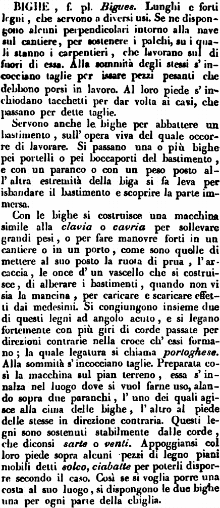 Con le bighe si costruisce una macchina simile alla clavia o cavria per sollevare grandi pesi, o per fare manovre forti in un cantiere o in un porto, come sono quelle di mettere al suo posto la ruota di prua, l'arcaccia, le once d'un vascello che si costruisce, di alberare i bastimenti, quando non vi sia la mancina, per caricare e scaricare effetti dai medesimi. Si congiungono insieme due di questi legni ad angolo acuto, e si legano fortemente con più giri di corde passate per direzioni contrarie nella croce ch'essi formano; la quale legatura si chiama portoghese. Alla sommità s'incocciano taglie. Preparata così la macchina sul pian terreno, essa s'innalza nel luogo dove si vuol farne uso, alando sopra due paranchi, l'uno dei quali agisce alla cima delle bighe, l'altro al piede delle stesse in direzione contraria. Questi legni sono sostenuti stabilmente dalle corde, che diconsi sarte o venti. Appoggiansi col loro piede sopra alcuni pezzi di legno piani mobili detti solco, ciabatte per poterli disporre secondo il caso. Così se si voglia porre una costa al suo luogo, si dispongono le due bighe una per ogni parte della chiglia. [immagine] |