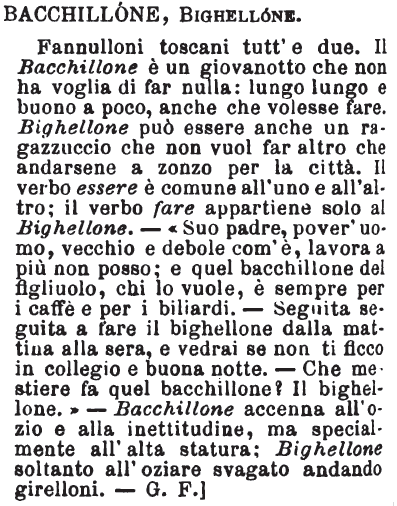 | Bacchillone, Bighellone - Fannulloni toscani tutt'e due. Il bacchillone è un giovanotto che non ha voglia di far nulla: lungo lungo e buono a poco, anche che volesse fare. Bighellone può essere anche un ragazzuccio che non vuol far altro che andarsene a zonzo per la città. Il verbo essere è comune all'uno e all'altro; il verbo fare appartiene solo al Bighellone. - «Suo padre, pover'uomo, vecchio e debole com'è, lavora a più non posso; e quel bacchillone del figliuolo, chi lo vuole, è sempre per i caffè e per i biliardi. - Seguita seguita a fare il bighellone dalla mattina alla sera, e vedrai se non ti ficco in collegio e buona notte. - Che mestiere fa quel bacchillone? Il bighellone.» - Bacchillone accenna all'ozio e alla inettitudine, ma specialmente all'alta statura; Bighellone soltanto all'oziare svagato andando girelloni. - G.F.] [immagine] |