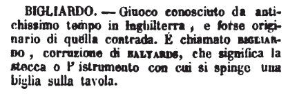 | Bigliardo - Giuoco conosciuto da antichissimo tempo in Inghilterra, e forse originario di quella contrada. E' chiamato bigliardo, corruzione di balyarde, che significa la stecca o l'istrumento con cui si spinge una biglia sulla tavola. [immagine] |