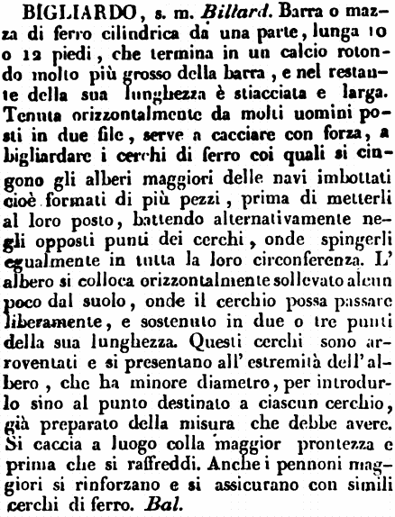 | Bigliardo - s. m. Billard. Barra o mazza di ferro cilindrica da una parte, lunga 10 o 12 piedi, che termina in un calcio rotondo molto più grosso della barra, e nel restante della sua lunghezza è stiacciata e larga. Tenuta orizzontalmente da molti uomini posti in due file, serve a cacciare con forza, a bigliardare i cerchi di ferro coi quali si cingono gli alberi maggiori delle navi imbottati cioè formati di più pezzi, prima di metterli al loro posto, battendo alternativamente negli opposti punti dei cerchi, onde spingerli egualmente in tutta la loro circonferenza. L'albero si colloca orizzontalmente sollevato alcun poco dal suolo, onde il cerchio possa passare liberamente, e sostenuto in due o tre punti della sua lunghezza. Questi cerchi sono arroventati e si presentano all'estremità dell'albero, che ha minore diametro, per introdurlo sino al punto destinato a ciascun cerchio, già preparato della misura che debbe avere. Si caccia a luogo colla maggior prontezza e prima che si raffreddi. Anche i pennoni maggiori si rinforzano e si assicurano con simili cerchi di ferro. Bal. [immagine] |