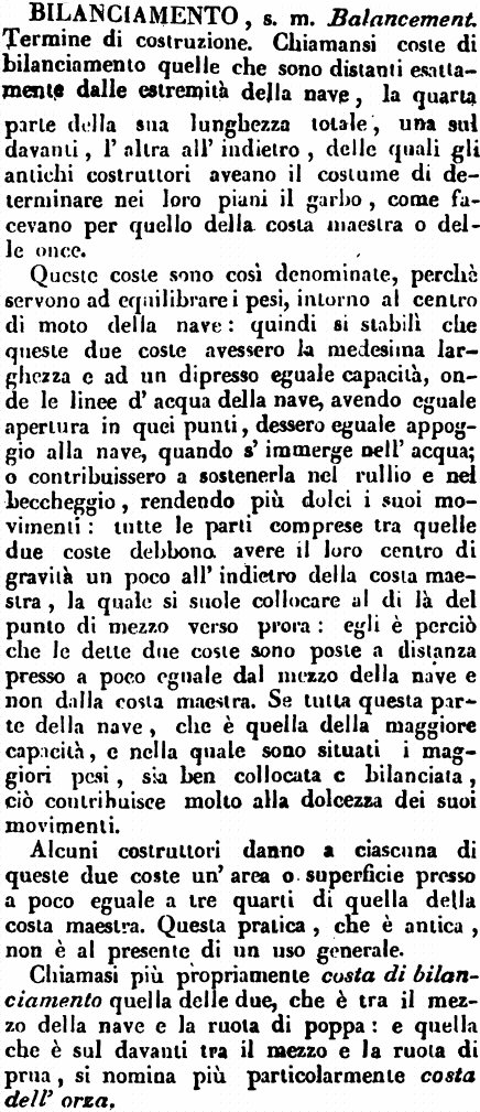 | Bilanciamento - s. m. Balancement. Termine di costruzione. Chiamansi coste di bilanciamento quelle che sono distanti esattamente dalle estremità della nave, la quarta parte della sua lunghezza totale, una sul davanti, l'altra all'indietro, delle quali gli antichi costruttori aveano il costume di determinare nei loro piani il garbo, come facevano per quello della costa maestra o delle once.