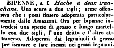 | Bipenne - s. f. Hache è deux tranchans. Una scure a due tagli; arme offensiva che i poeti finsero adoperata particolarmente dalle Amazzoni. Ora per bipenne intendesi una spezie di grosso e lungo martello con due tagli, l'uno dritto e l'altro attraverso. Adoperasi dai legnaiuoli di grosso per iscavare e fare incassi nei grossi legnami. [immagine] |
