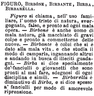| Figuro, Birbone, Birbante, Birba, Birbarella - Figuro si chiama, nell'uso familiare, l'uomo tristo di natura, svergognato, falso, e pronto ad ogni mala opera. - Birbone è anche uomo di mala natura, già macchiato di gravi colpe e pronto a commetterne delle nuove. - Birbante è colui che si è dato alla mala vita, e che studia il modo di camparla, ingannando altrui e andando in busca di illeciti guadagni. - Birba si dice specialmente de' fanciulli o giovanetti che sono pronti al mal fare, sdegnosi di ogni disciplina e simili. - Birbarella è diminutivo di Birba, e si dice spesso a' fanciulli per modo di amorevole riprensione. [immagine] |