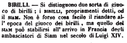 | Birilli - Si distinguono due sorta di giuoco di birilli; i birilli, propriamente detti, ed il siam. Non è forse cosa facile il riandare all'epoca del giuoco dei birilli, ma quello del siam può stabilirsi all'arrivo in Francia degli ambasciatori di Siam nel secolo di Luigi XIV. [immagine] |