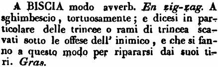 | A Biscia - modo avverb. En zig-zag. A sghimbescio, tortuosamente; e dicesi in particolare delle trincee o rami di trincea scavati sotto le offese dell'inimico, e che si fanno a questo modo per ripararsi dai suoi tiri. Gras. [immagine] |