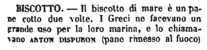 | Biscotto - Il biscotto di mare è un pane cotto due volte. I Greci ne facevano un grande uso per la loro marina, e lo chiamavano arton dispuron (pane rimesso al fuoco) [immagine] |