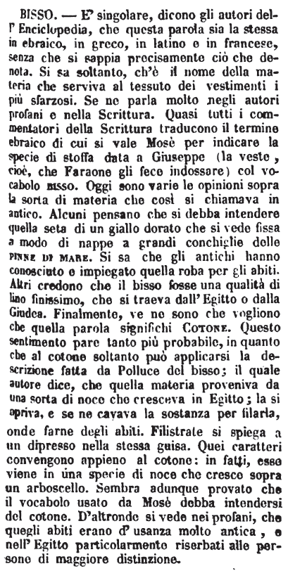 Bisso - Il Bisso, di cui si facevano le stoffe d'una gran finezza, e stimate moltissimo dagli Antichi, soprattutto in Egitto ed in Siria, era secondo la più comune opinione una specie di seta d'un giallo dorato.