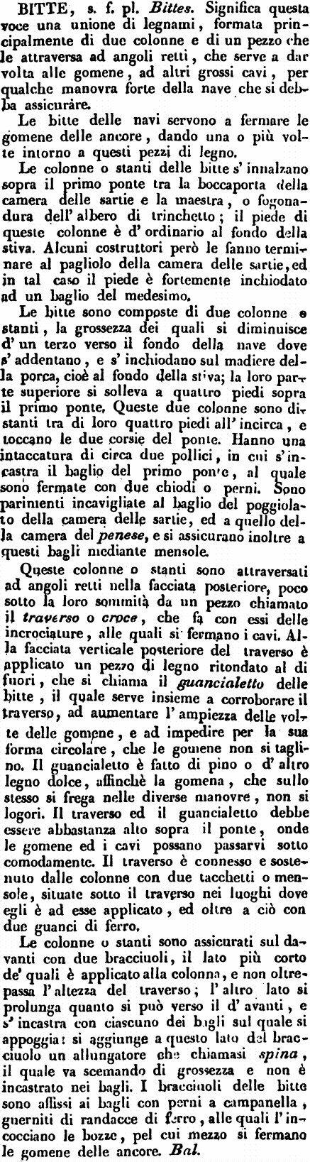 | Bitte - s. f. pl. Bittes. Significa questa voce una unione di legnami, formata principalmente di due colonne e di un pezzo che le attraversa ad angoli retti, che serve a dar volta alle gomene, ad altri grossi cavi, per qualche manovra forte della nave che si debba assicurare.