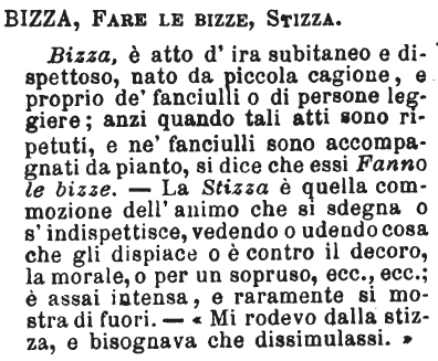 | Bizza, Fare le bizze, Stizza - Bizza, è atto d'ira subitaneo e dispettoso, nato da piccola cagione, e proprio de' fanciulli o di persone leggiere; anzi quando tali atti sono ripetuti, e ne' fanciulli sono accompagnati da pianto, si dice che essi Fanno le bizze. - La Stizza è quella commozione dell'animo che si sdegna o s'indispettisce, vedendo o udendo cosa che gli dispiace o è contro il decoro, la morale, o per un sopruso, ecc., ecc.; è assai intensa, e raramente si mostra di fuori. - «Mi rodevo dalla stizza, e bisognava che dissimulassi.» [immagine] |