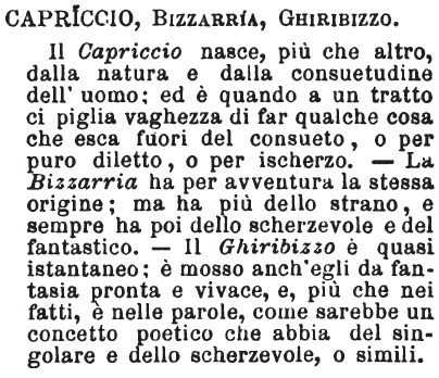 | Capriccio, Bizzarria, Ghiribizzo - Il Capriccio nasce, più che altro, dalla natura e dalla consuetudine dell'uomo; ed è quando a un tratto ci piglia vaghezza di far qualche cosa che esca fuori del consueto, o per puro diletto, o per ischerzo. - La Bizzarria ha per avventura la stessa origine; ma ha più dello strano, e sempre ha poi dello scherzevole e del fantastico. - Il Ghiribizzo è quasi istantaneo; è mosso anch'egli da fantasia pronta e vivace, e, più che nei fatti, è nelle parole, come sarebbe un concetto poetico che abbia del singolare e dello scherzevole, o simili. [immagine] |