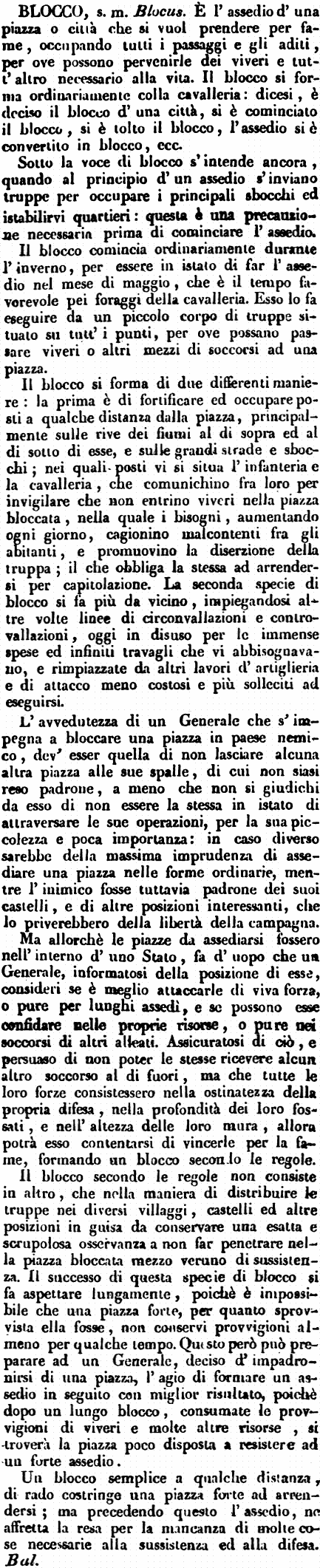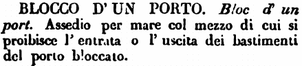| Blocco - s. m. Blocus. È l'assedio d'una piazza o città che si vuol prendere per fame, occupando tutti i passaggi e gli aditi, per ove possono pervenirle dei viveri e tutt'altro necessario alla vita. Il blocco si forma ordinariamente colla cavalleria: dicesi, è deciso il blocco d'una città, si è cominciato il blocco, si è tolto il blocco, l'assedio si è convertito in blocco, ecc.