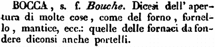 | Bocca - s.f. Bouche. Dicesi dell'apertura di molte cose, come del forno, fornello, mantice, ecc.: quelle delle fornaci da fondere diconsi anche portelli. [immagine] |
