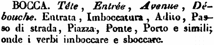 | Bocca - Téte, Entrée, Avenue, Débouche. Entrata, Imboccatura, Adito, Passo di strada, Piazza, Ponte, Porto e simili; onde i verbi imboccare e sboccare. [immagine] |