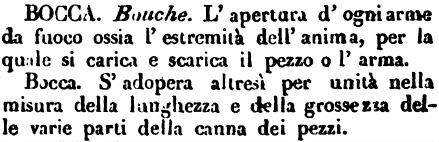 | Bocca - Bouche. L'apertura d'ogni arme da fuoco ossia l'estremità dell'anima, per la quale si carica e scarica il pezzo o l'arma.