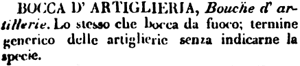 | Bocca d'artiglieria - Bouche d'artillerie. Lo stesso che bocca da fuoco; termine generico delle artiglierie senza indicarne la specie. [immagine] |