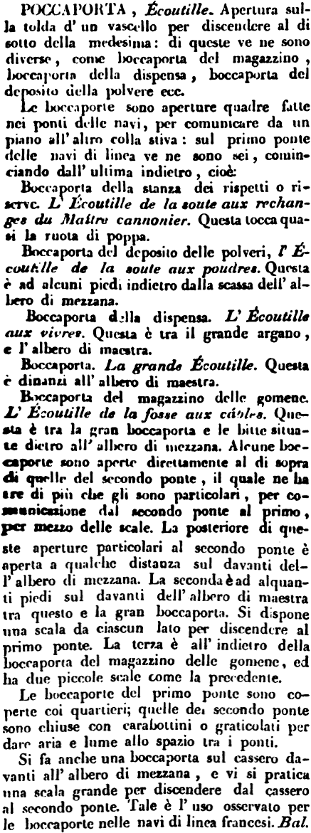 | Boccaporta - Écoutille. Apertura sulla tolda d'un vascello per discendere al di sotto della medesima: di queste ve ne sono diverse, come boccaporta del magazzino, boccaporta della dispensa, boccaporta del deposito della polvere ecc.