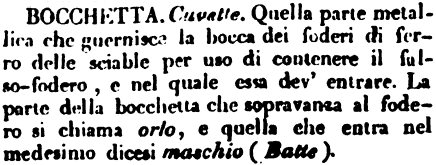 | Bocchetta - Cuvette. Quella parte metallica che guernisce la bocca dei foderi di ferro delle sciable per uso di contenere il falso-fodero, e nel quale essa dev'entrare. La parte della bocchetta che sopravanza al fodero si chiama orlo, e quella che entra nel medesimo dicesi maschio (Batte). [immagine] |