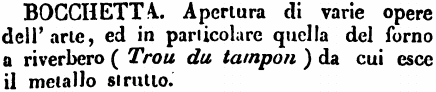 | Bocchetta - Apertura di varie opere dell'arte, ed in particolare quella del forno a riverbero (Trou du tampon) da cui esce il metallo strutto. [immagine] |