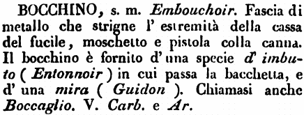 | Bocchino - s. m. Embouchoir. Fascia di metallo che strigne l'estremità della cassa del fucile, moschetto e pistola colla canna. Il bocchino è fornito d'una specie d'imbuto (Entonnoir) in cui passa la bacchetta, e d'una mira (Guidon). Chiamasi anche Boccaglio. V. Carb. e Ar. [immagine] |