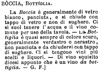 | Boccia, Bottiglia - La Boccia è generalmente di vetro bianco, panciuta, e si chiude con tappo di vetro e non di sughero. Ci si suol tenere l'acqua e il vino comune per uso della tavola. - La Bottiglia è quasi sempre di colore scuro, generalmente verdastro o nerastro, non panciuta e da chiudersi con tappo di sughero. Ci si tengono vini più scelti e liquori. - Di vino squisito dicesi appunto che è un vino da bottiglia. - G. F.] [immagine] |