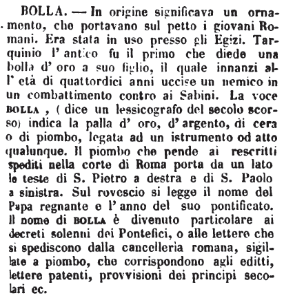 | Bolla - In origine significava un ornamento, che portavano sul petto i giovani Romani. Era stata in uso presso gli Egizi. Tarquinio l'antico fu il primo che diede una bolla d'oro a suo figlio, il quale innanzi all'età di quattordici anni uccise un nemico in un combattimento contro ai Sabini. La voce bolla, (dice un lessicografo del secolo scorso) indica la palla d'oro, d'argento, di cera o di piombo, legata ad un istrumento od atto qualunque. Il piombo che pende ai rescritti spediti nella corte di Roma porta da un lato le teste di S. Pietro a destra e di S. Paolo a sinistra. Sul rovescio si legge il nome del Papa regnante e l'anno del suo pontificato. Il nome di bolla è divenuto perticolare ai decreti solenni dei Pontefici, o alle lettere che si spediscono dalla cancelleria romana, sigillate a piombo, che corrispondono agli editti, lettere patenti, provvisioni dei principi secolari ec. [immagine] |