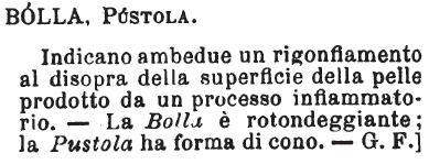 | Bolla, Pustola - Indicano ambedue un rigonfiamento al disopra della superficie della pelle prodotto da un processo infiammatorio. - La Bolla è rotondeggiante; la Pustola ha forma di cono. - G. F.] [immagine] |