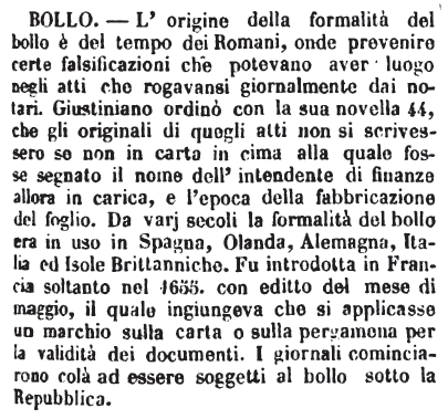 | Bollo - L'origine della formalità del bollo è del tempo dei Romani, onde prevenire certe falsificazioni che potevano aver luogo negli atti che rogavansi giornalmente dai notari. Giustiniano ordinò con la sua novella 44, che gli originali di quegli atti non si scrivessero se non in carta in cima alla quale fosse segnato il nome dell'intendente di finanze allora in carica, e l'epoca della fabbricazione del foglio. Da varj secoli la formalità del bollo era in uso in Spagna, Olanda, Alemagna, Italia ed Isole Brittanniche. Fu introdotta in Francia soltanto nel 1655. con editto del mese di maggio, il quale ingiungeva che si applicasse un marchio sulla carta o sulla pergamena per la validità dei documenti. I giornali cominciarono colà ad essere soggetti al bollo sotto la Repubblica. [immagine] |