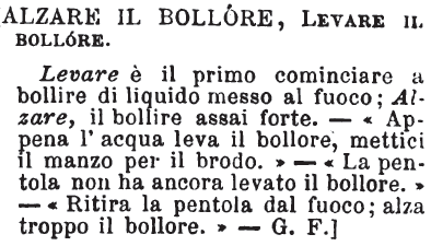 | Alzare il bollore, Levare il bollore - Levare è il primo cominciare a bollire di liquido messo al fuoco; Alzare, il bollire assai forte. - « Appena l'acqua leva il bollore, mettici il manzo per il brodo. » - « La pentola non ha ancora levato il bollore. » - « Ritira la pentola dal fuoco; alza troppo il bollore. » - G. F.] [immagine] |
