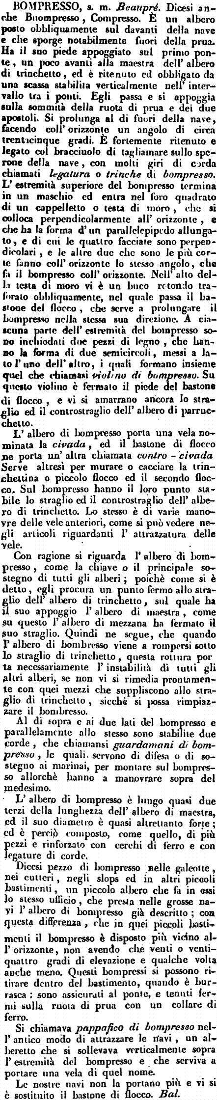 | Bompresso - e BUOMPRESSO. S. m. (Mar.) Albero moltissimo inclinato e anzi disteso sulla prua e spinto assai avanti fuori del bordo: nelle barche e nei latini quest'albero chiamasi Bittalò.