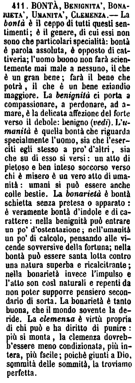 | Bontà, Benignità, Bonarietà, Umanità, Clemenza - La bontà è il ceppo di tutti questi sentimenti; è il genere, di cui essi non sono che particolari specialità: bontà è parola assoluta, è opposto di cattiveria; l'uomo buono non farà scientemente mai male a nessuno, il che è un gran bene; farà il bene che potrà, il che è un bene eziandio maggiore. La benignità ci porta a compassionare, a perdonare, ad amare, è la delicata affezione del forte verso il debole: benigno (vedi). L'umanità è quella bontà che riguarda specialmente l'uomo, sia che l'eserciti egli stesso a pro' d'altri, sia che su di esso si versi: un atto di pietoso e ben inteso soccorso verso chi è misero è un vero atto di umanità: umani si può essere anche colle bestie. La bonarietà è bontà schietta senza pretesa o apparato: è veramente bontà d'indole e di carattere: nella benignità può entrare un po' d'ostentazione; nell'umanità un po' di calcolo, pensando alle vicende sovversive della fortuna; nella bontà può essere santa lotta contro una natura superba e ricalcitrante; nella bonarietà invece l'impulso e l'atto son così naturali e repenti da non poter supporre pensiero secondario di sorta. La bonarietà è tanto buona, che il mondo sovente la deride. La clemenza è virtù propria di chi può e ha diritto di punire: più si monta, la clemenza dovrebb'essere meno condizionata, più intera, più facile; poiché giunti a Dio, sommità delle sommità, la troviamo perfetta. [immagine] |