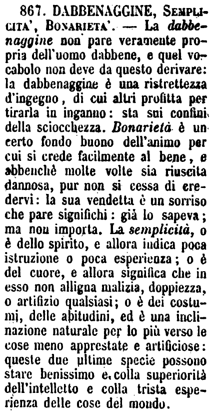| Dabbenaggine, Semplicità, Bonarietà - La dabbenaggine non pare veramente propria dell'uomo dabbene, e quel vocabolo non deve da questo derivare: la dabbenaggine è una ristrettezza d'ingegno, di cui altri profitta per tirarla in inganno: sta sui confini della sciocchezza. Bonarietà è un certo fondo buono dell'animo per cui si crede facilmente al bene, e abbenchè molte volte sia riuscita dannosa, pur non si cessa di credervi: la sua vendetta è un sorriso che pare significhi: già lo sapeva; ma non importa. La semplicità, o è dello spirito, e allora indica poca istruzione o poca esperienza; o è del cuore, e allora significa che in esso non alligna malizia, doppiezza, o artifizio qualsiasi; o è dei costumi, delle abitudini, ed è una inclinazione naturale per lo più verso le cose meno apprestate e artificiose: queste due ultime specie possono stare benissimo e colla superiorità dell'intelletto e colla trista esperienza delle cose del mondo. [immagine] |