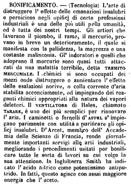 | Bonificamento - (Tecnologia) L'arte di distruggere l'effetto delle emanazioni insalubri e perniciose negli opificj di certe professioni industriali è una delle più utili pella umanità, ed è tutta dei nostri tempi. Gli artieri che lavorano il piombo, il rame, il mercurio, provano in breve un deterioramento, il quale si manifesta con la pallidezza, la magrezza e una costante malinconia. Gl'indoratori e quelli che adoprano il mercurio sono quasi tutti attaccati da una malattia terribile, detta tremito mercuriale. I chimici si sono occupati dei mezzi onde distruggere o annientare l'effetto delle esalazioni nocive, o colla corrente d'aria stabilita acconciamente, od impiegando dei reagenti chimici appropriati alla natura dei vapori deleteri. Il ventilatore di Hales, chiamato tarare, è uno dei più semplici per rinnovare l'aria. I caminetti o fornelli d'appel s'impiegano parimente con utilità a purificare gli opificj insalubri. D'Arcet, membro dell'Accademia delle Scienze di Francia, rende giornalmente importanti servigi alle arti industriali, megliorando i procedimenti usitati per bonificare tutte le sorta di lavori su cui volge la sua attenzione. In Inghilterra Smith ha indicato l'acido nitrico come potentissimo antiputrido. In fatti, questo agisce con assai maggiore energia che l'aceto. [immagine] |