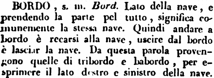 | Bordo - s.m. Bord. Lato della nave, e prendendo la parte pel tutto, significa comunemente la stessa nave. Quindi andare a bordo è recarsi alla nave, uscire dal bordo è lasciar la nave. Da questa parola provengono quelle di tribordo e babordo, per esprimere il lato destro e sinistro della nave. [immagine] |