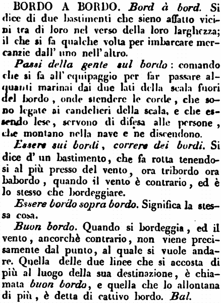 Passi della gente sul bordo: comando che si fa all'equipaggio per far passare alquanti marinai dai due lati della scala fuori del bordo, onde stendere le corde, che sono legate ai candelieri della scala, e che essendo tese, servono di difesa alle persone, che montano nella nave e ne discendono. Essere sui bordi, correre dei bordi. Si dice d'un bastimento, che fa rotta tenendosi al più presso del vento, ora tribordo ora babordo, quando il vento è contrario, ed è lo stesso che bordeggiare. Essere bordo sopra bordo. Significa la stessa cosa. Buon bordo. Quando si bordeggia, ed il vento, ancorchè contrario, non viene precisamente dal punto, al quale si vuole andare. Quella delle due linee che si accosta di più al luogo della sua destinazione, è chiamata buon bordo, e quella che lo allontana di più, è detta di cattivo bordo. Bal. [immagine] |